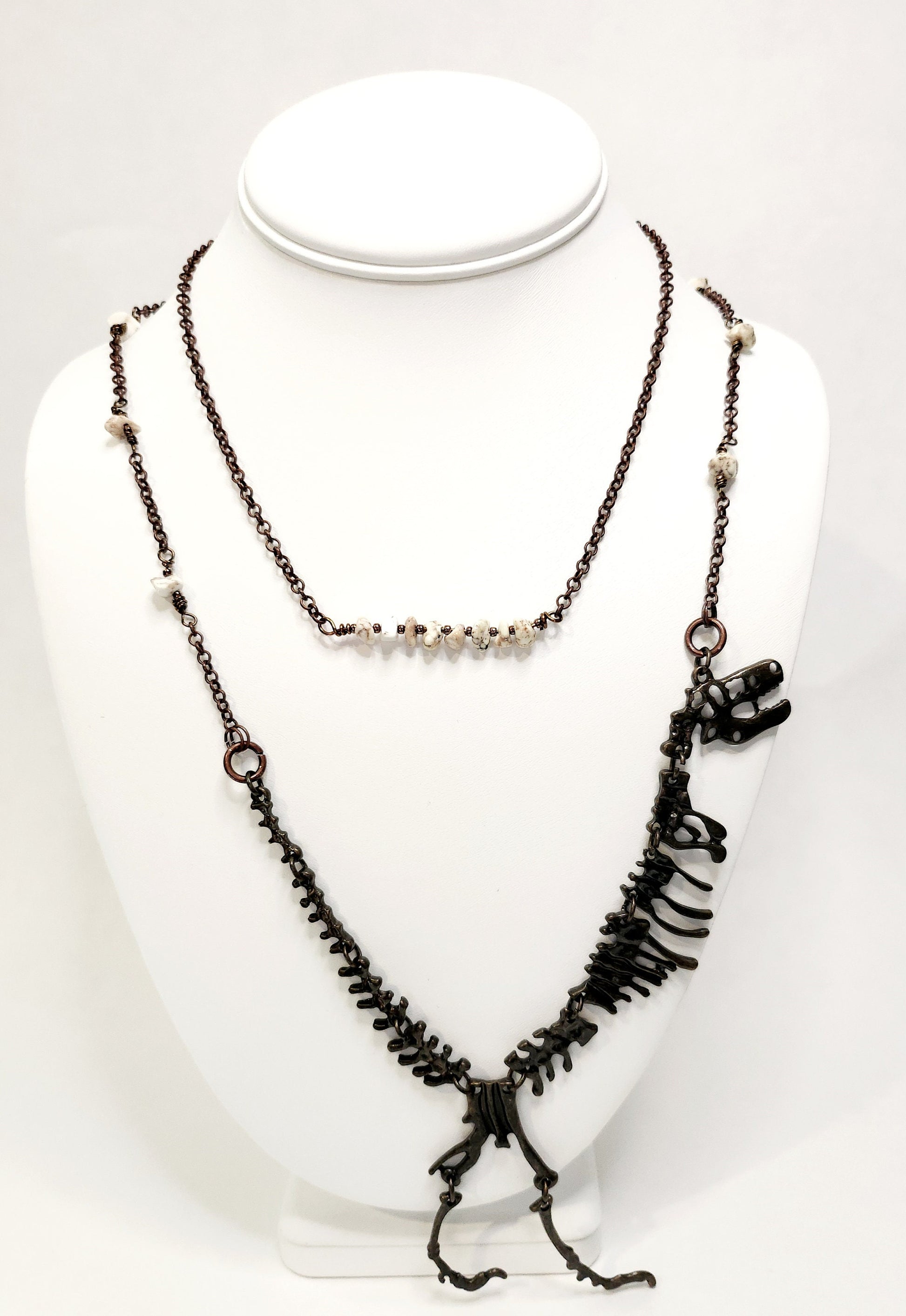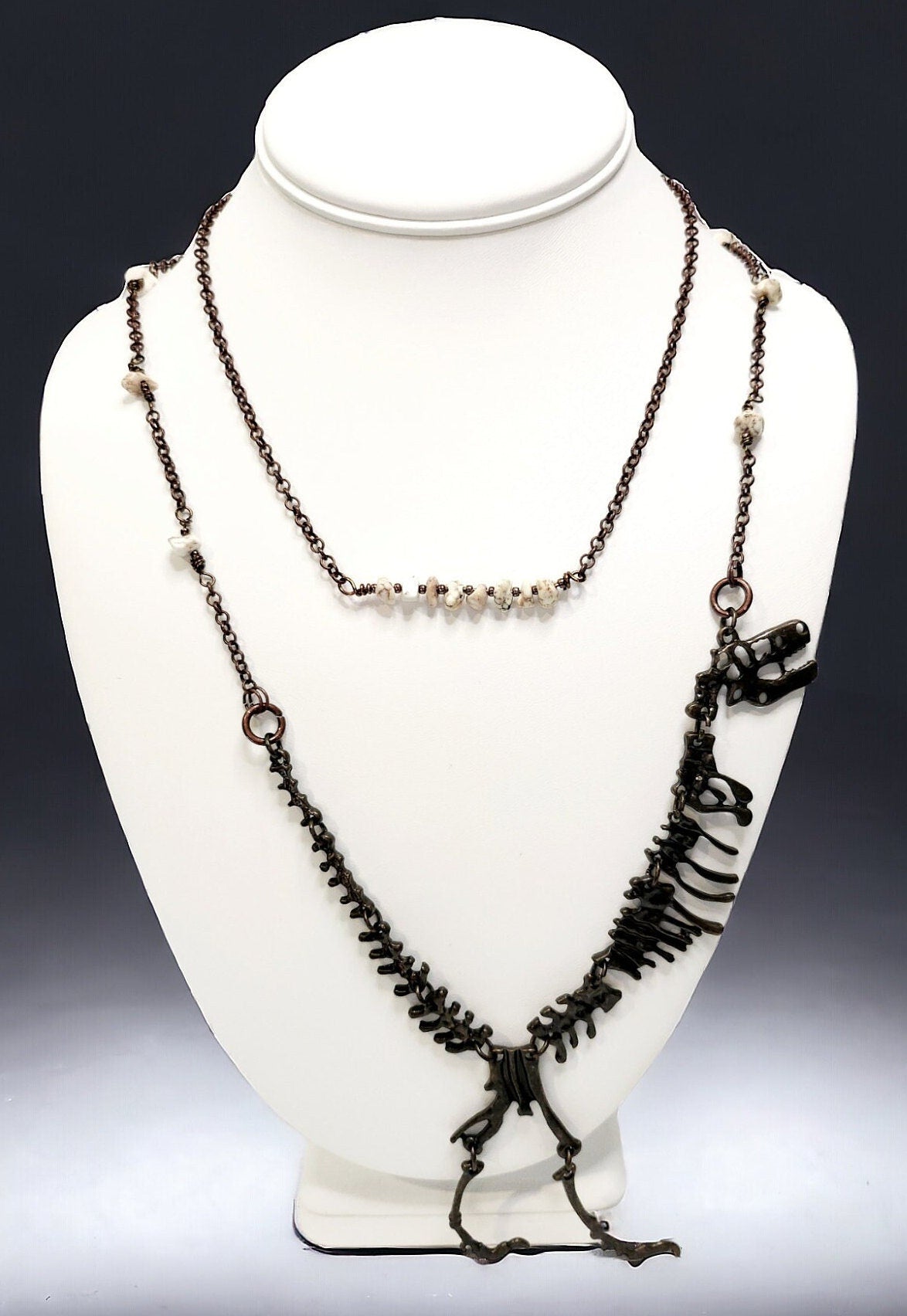 Make a bold, playful statement with this unique long necklace featuring a large bronze dinosaur pendant, linked with oversized antique bronzed jump rings for added character and charm. The pendant hangs from a hand-beaded antique bronze curb chain, accented with hand-wrapped natural howlite beads that bring earthy texture and contrast to the design.