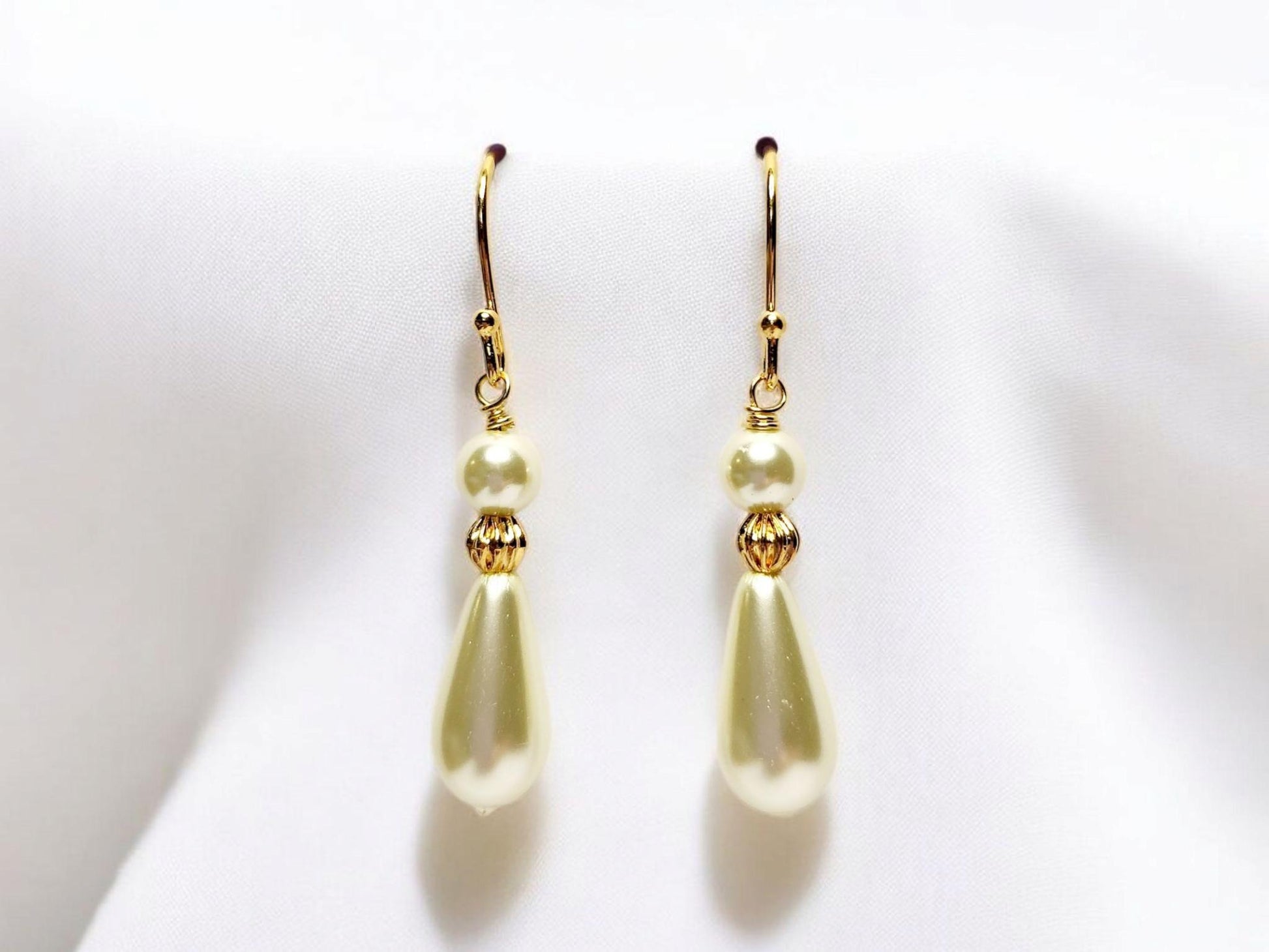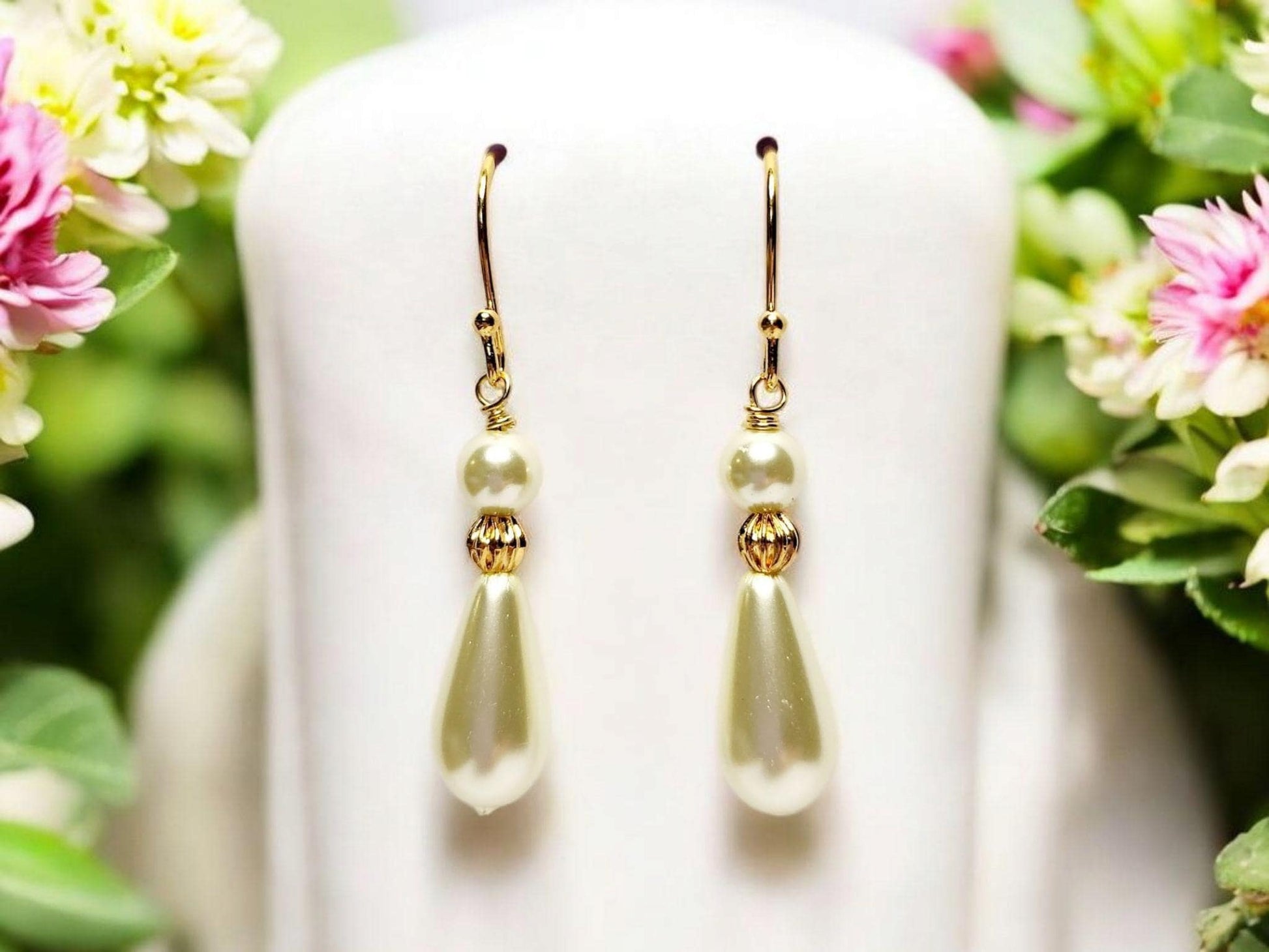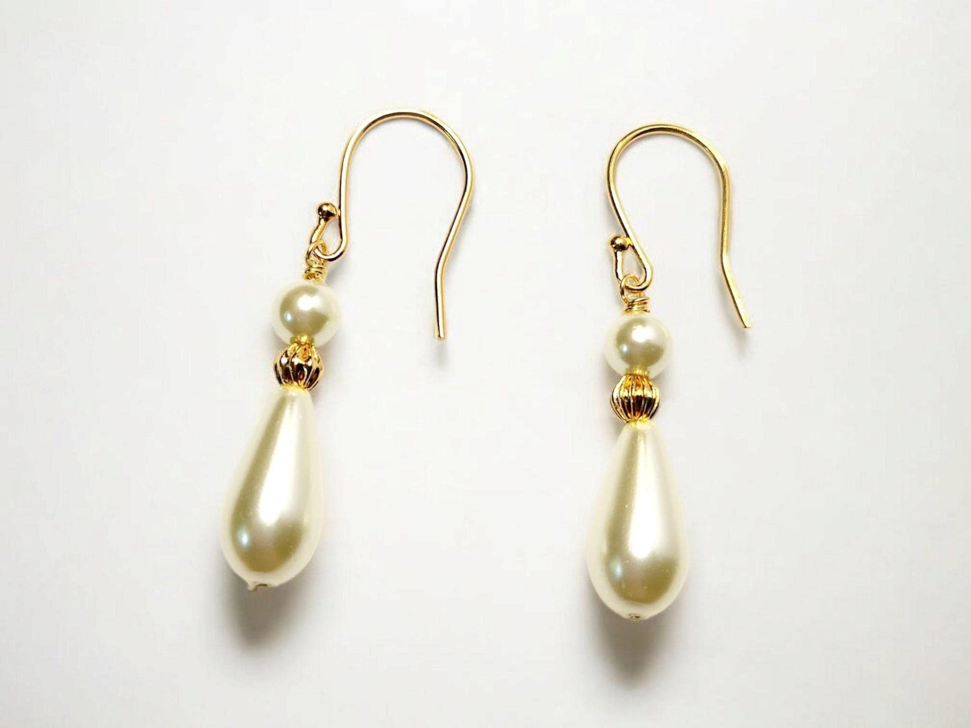 Classic sleek white crystal teardrop pearl earrings accented with gold plated beading and an additional 6mm pearl all set on gold plated fishhook ear wires. These earrings are approx. 1.5 inches in length.