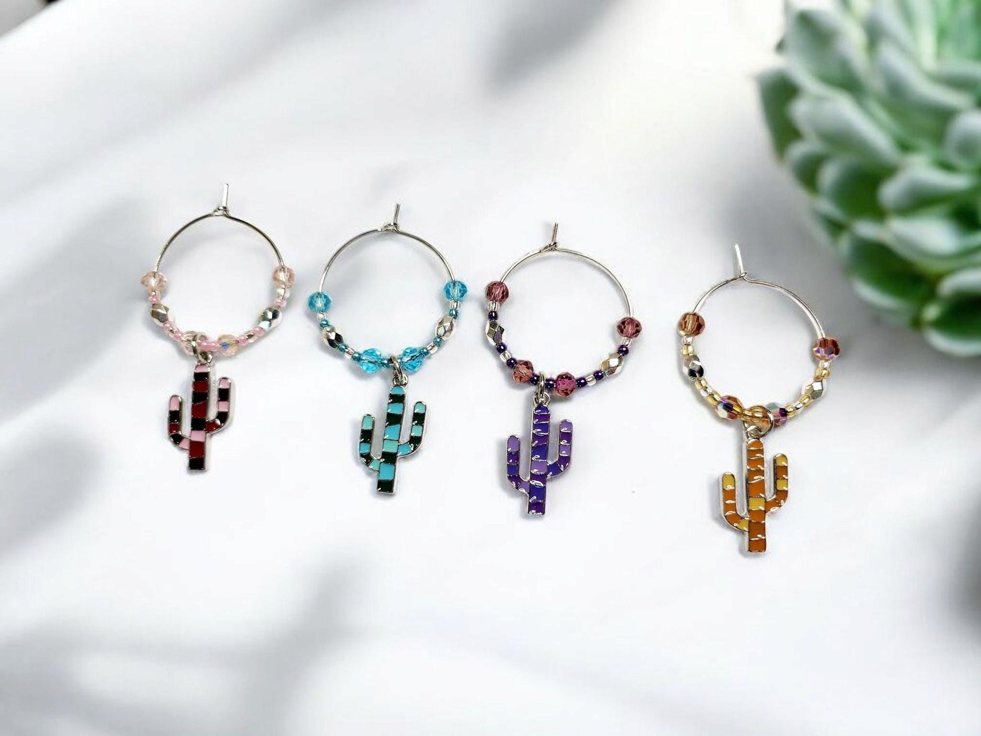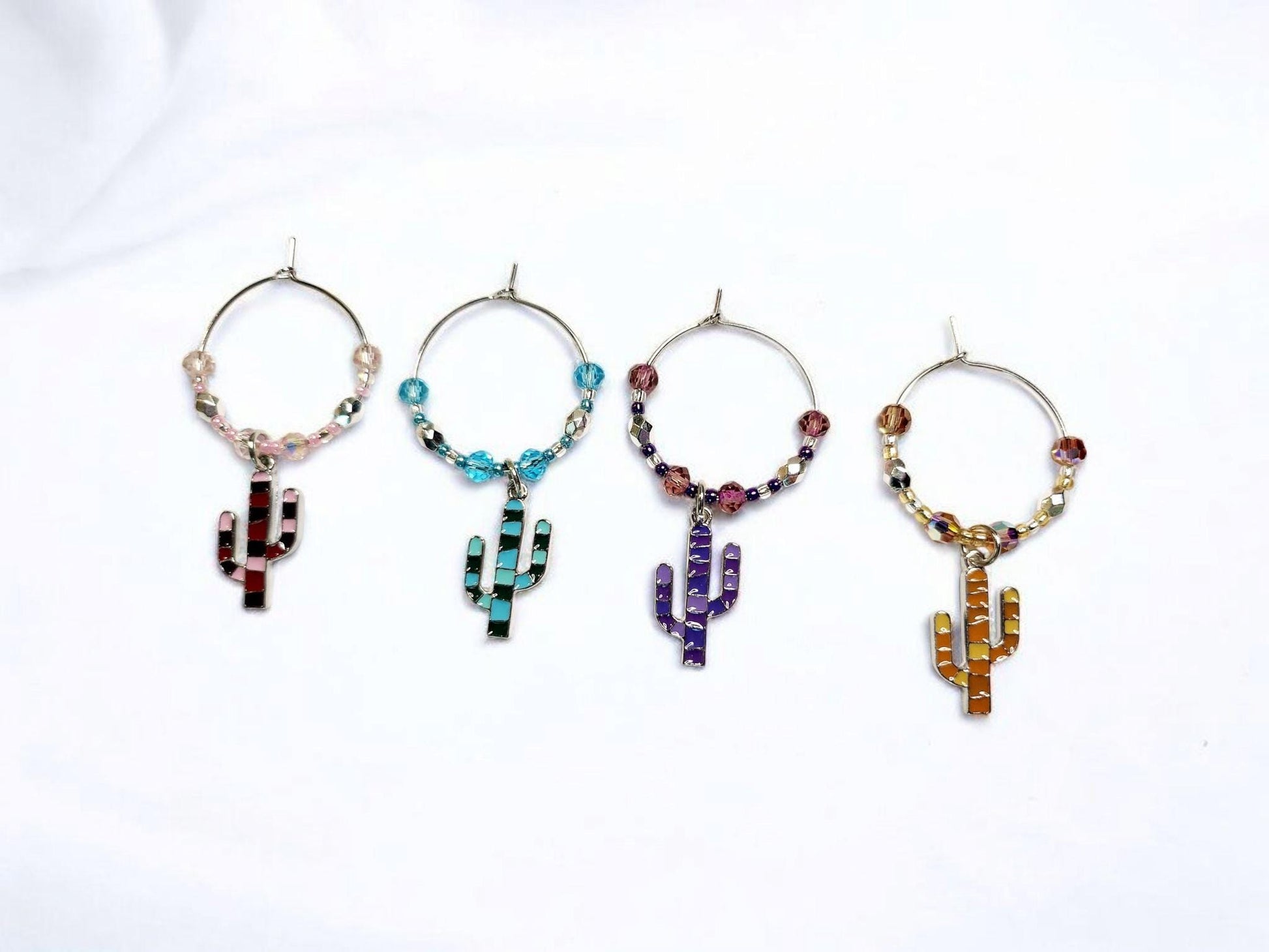 Four different bright enamel colored cactus set on silver plated wine charm holders. There is a pink/red cactus with pink crystal beading, blue/green cactus with blue beading, purple cactus with purple crystal beading and an orange cactus with orange beading. Fun for a southwestern/summer themed party.