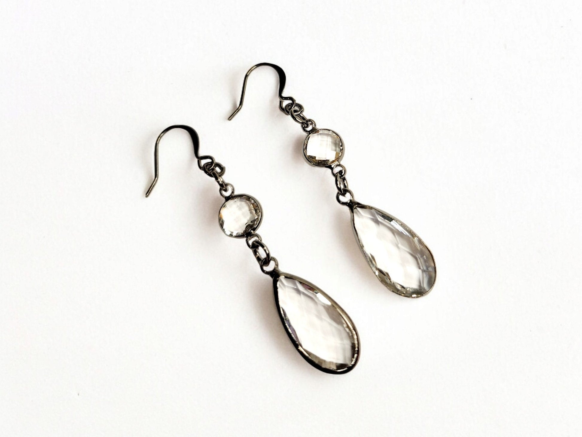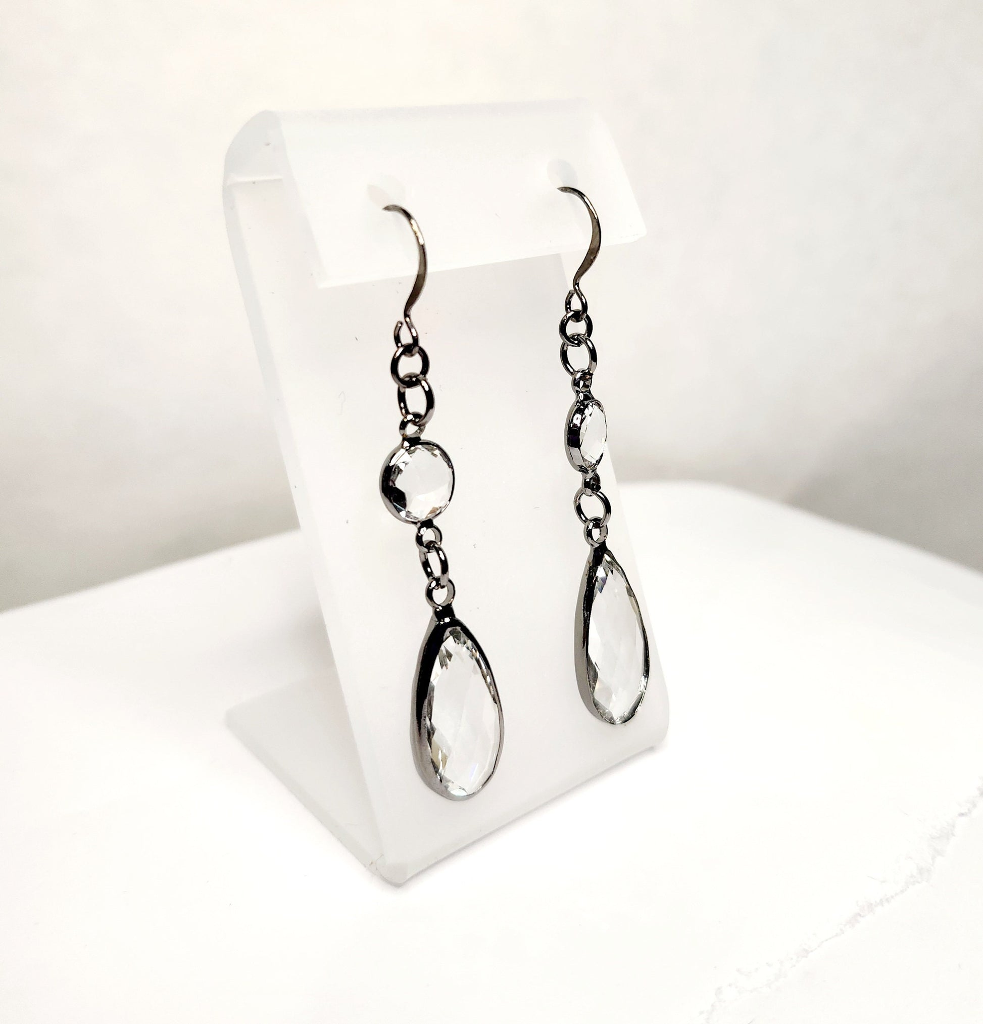 These elegant earrings feature two fancy-cut clear crystals set in vintage-inspired “pewter” tone bezels, offering a timeless sparkle with an old-world charm. The unique cut of the crystals gives them a distinctive, antique feel—reminiscent of heirloom jewelry from days gone by.