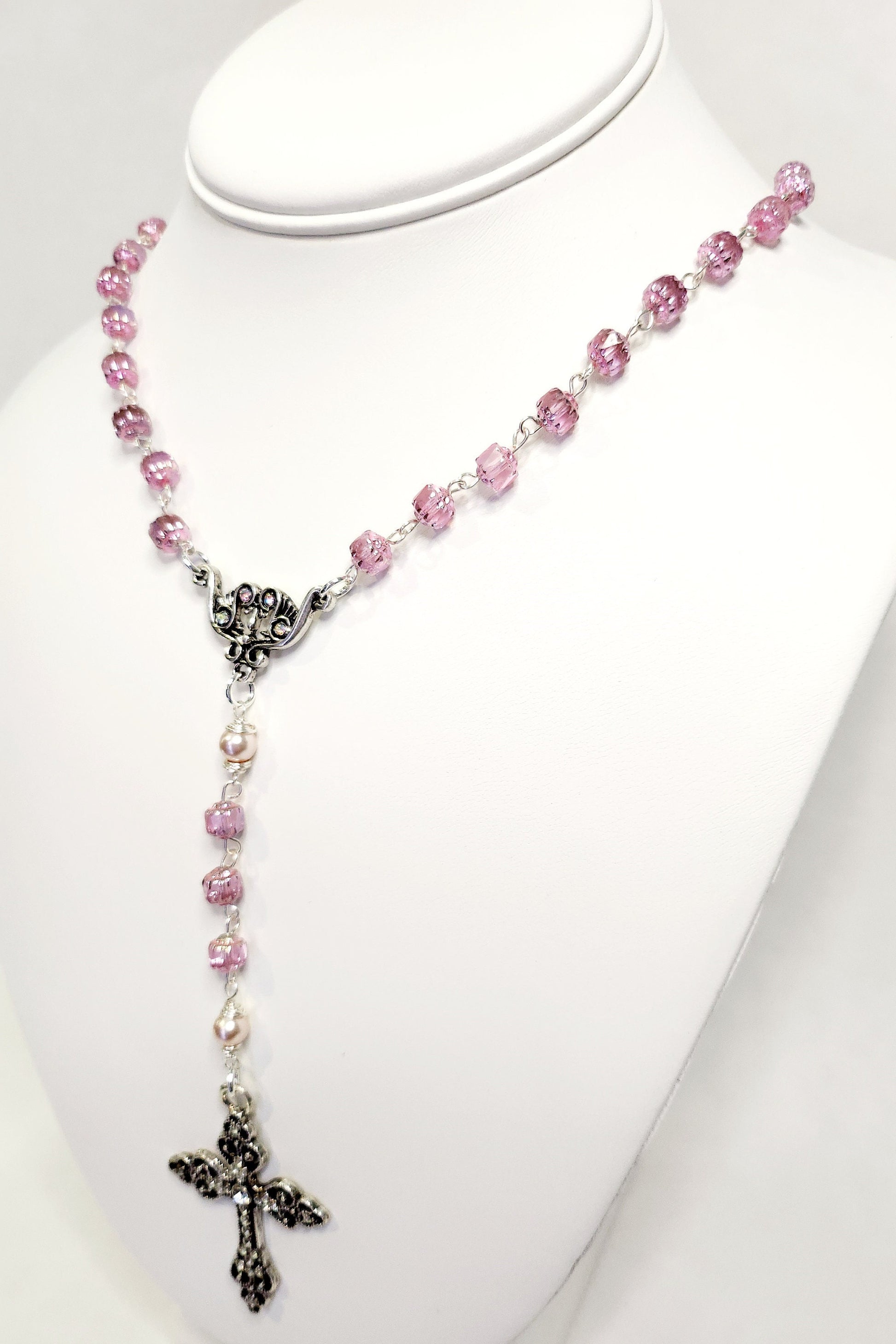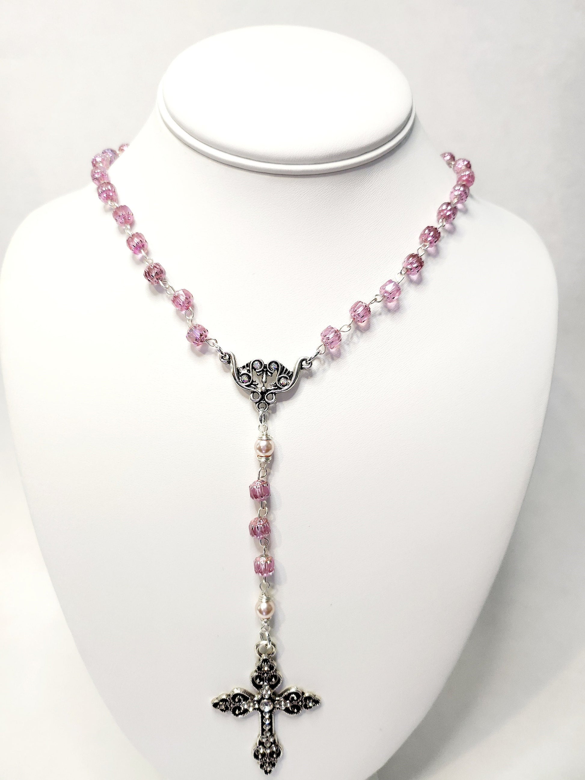 This beautiful handmade rosary features soft pink Cathedral-style Czech glass beads that shimmer with a delicate glow, offering a gentle and elegant touch. The “Our Father” beads are 6mm pink glass pearls, each carefully wire-wrapped to complement the surrounding crystal beads with graceful harmony.