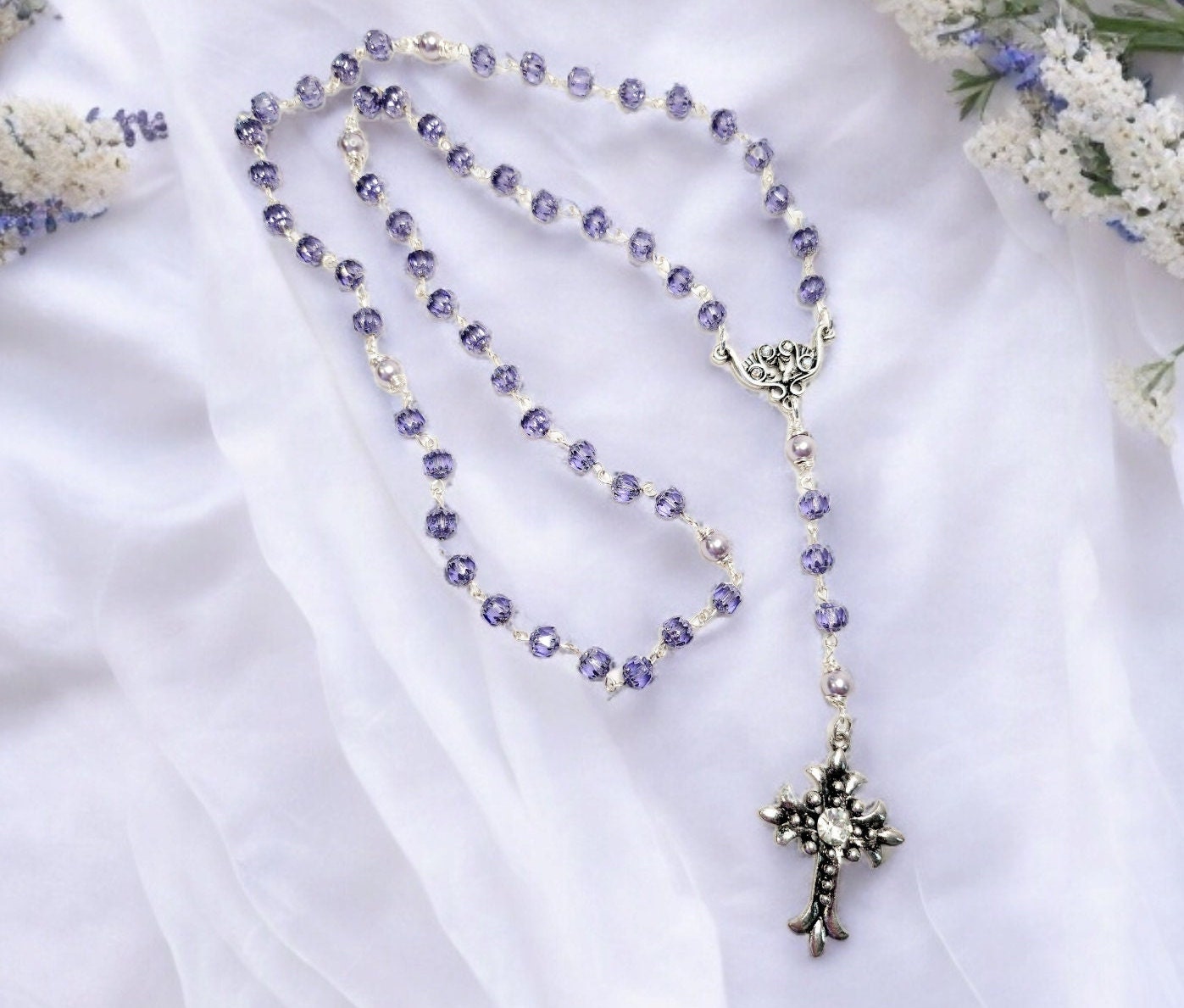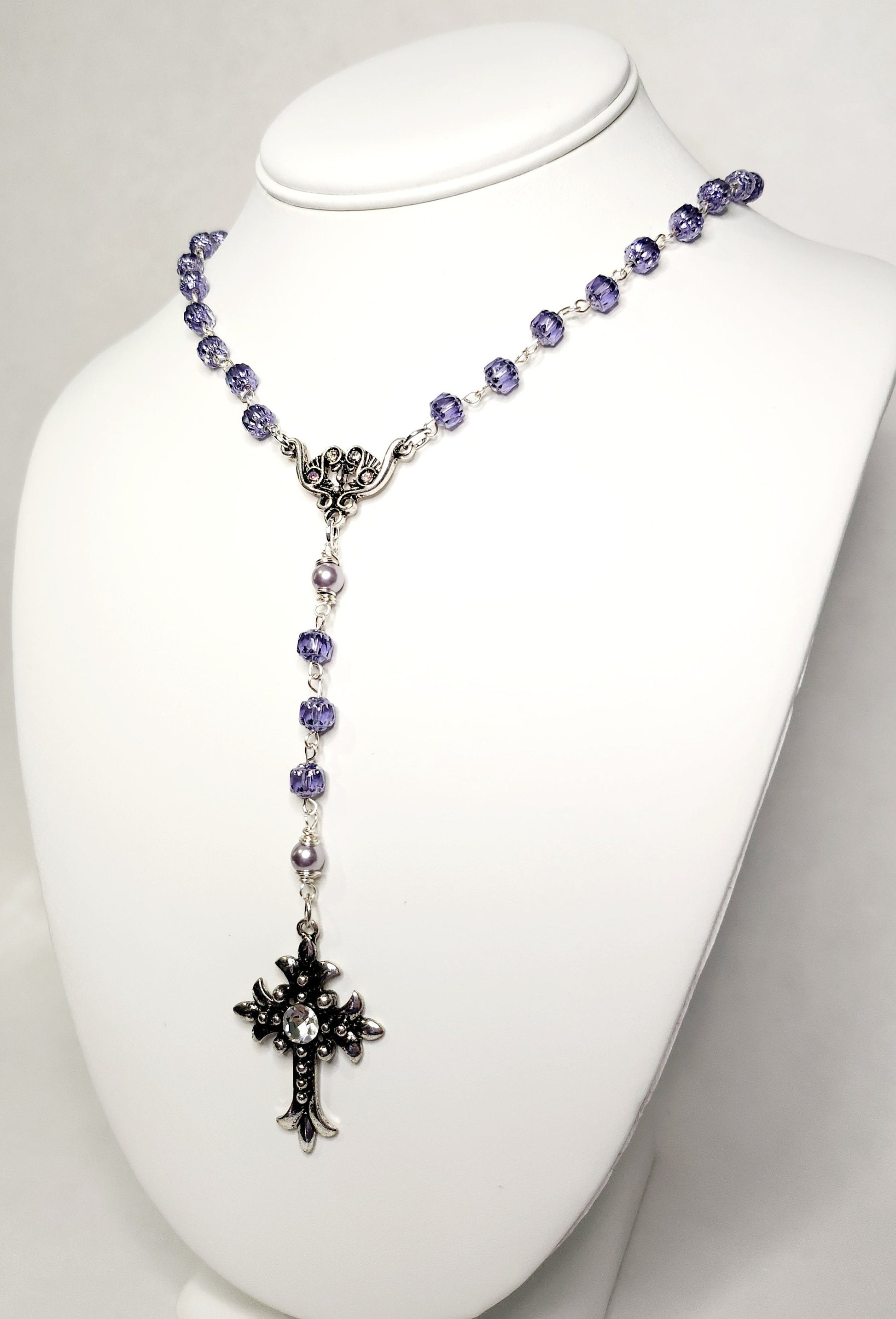This elegant handmade rosary features deep purple Cathedral-style Czech glass beads, radiating a rich, luminous glow with every prayer. Complementing the crystal beads are 6mm purple glass pearls, each wire-wrapped and used as the “Our Father” beads, adding a smooth and graceful contrast.