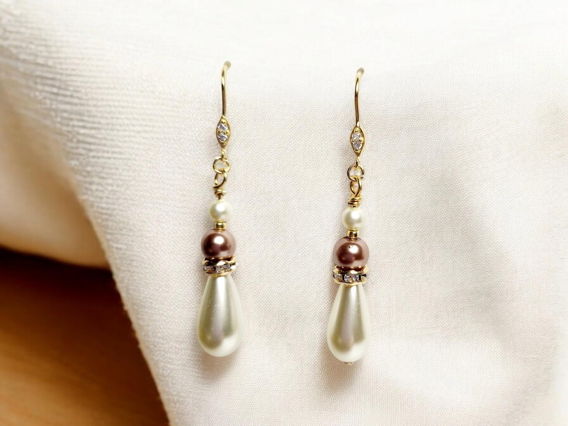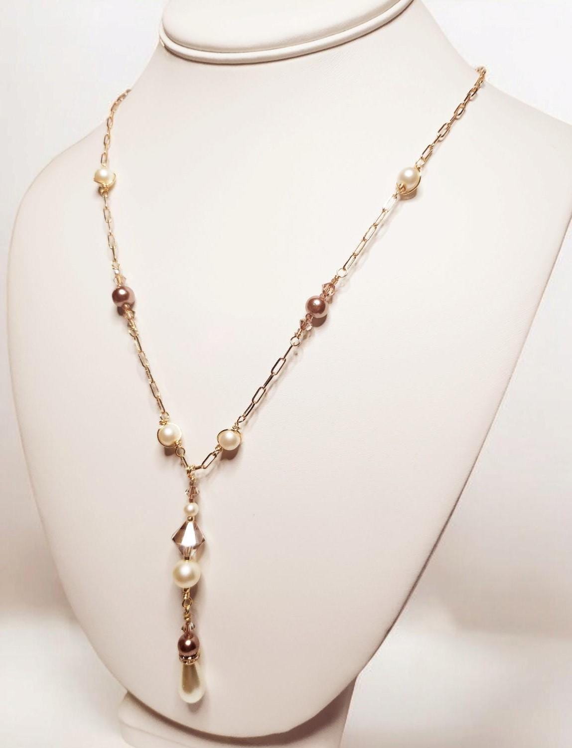Elegant white tear drop and mocha mousse pearl, with rhinestone rhondelle pendant, and golden topaz prism crystal. Handcrafted chain with gold plated wiring and paperclip chain with 6mm white and mocha mousse crystal pearls and lobster claw. This necklace is 24" inch length. This would pair nicely with the white tear drop pearl earrings.